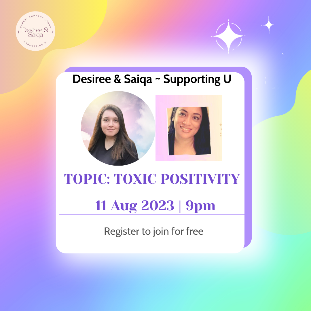 Desiree & Saiqa ~ Supporting U is back in August, discussing the topic of Toxic Positivity. Let’s talk about what this means to us and how we mitigate it. The session is free and limited to only caregivers / parents with special needs children. Details as follows: